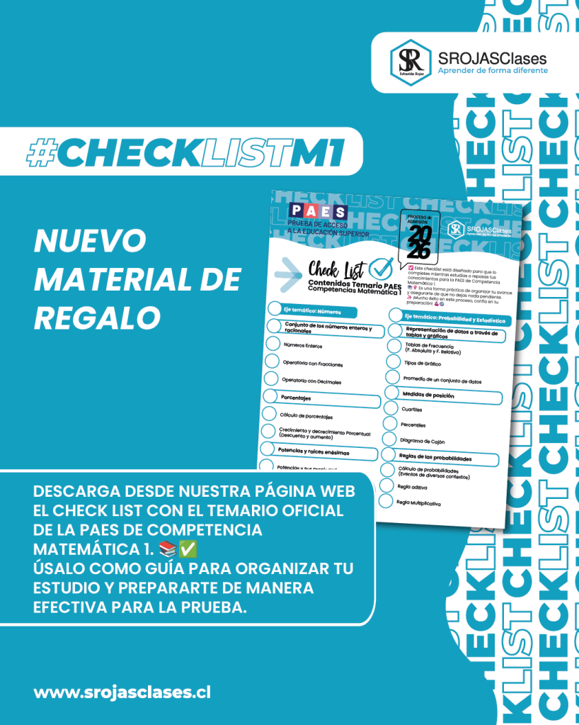 Prepárate de forma más organizada y efectiva para la PAES de Competencia Matemática 1 con este Check List gratuito, diseñado para ayudarte a visualizar tu avance y repasar cada tema con claridad.